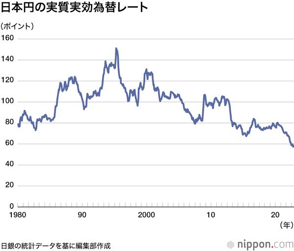 実質実効為替レート(円の本当の実力)は変動相場制に移行してから過去最低レベルになった原因は、「デフレ」です
