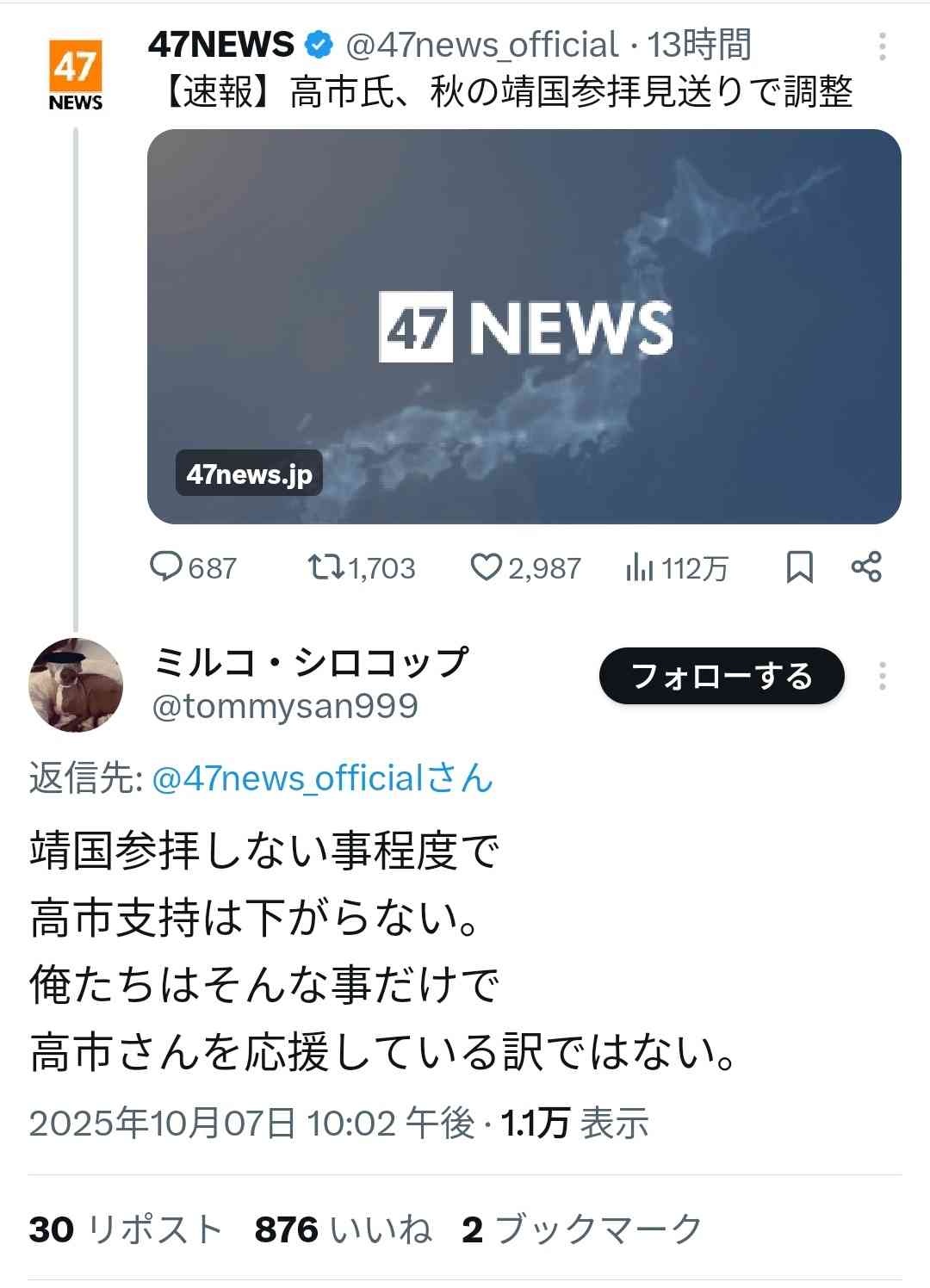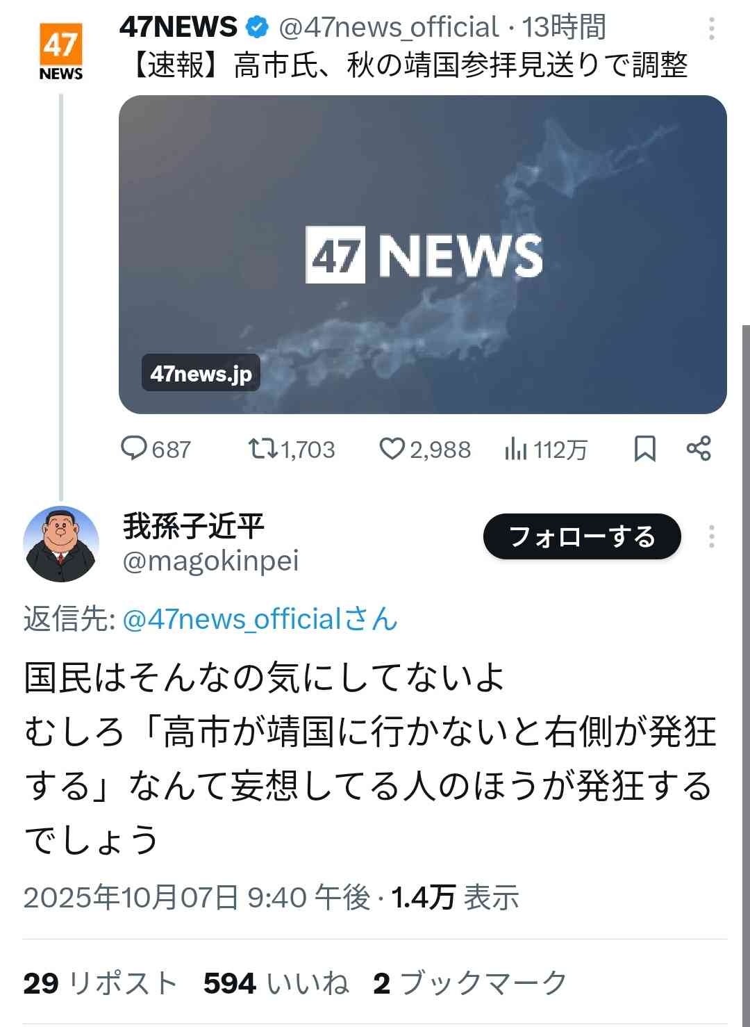 ネトウヨ「石破靖国参拝しろ😠」 高市「靖国参拝見送ります」 ネトウヨ「・。・(え~っと)」