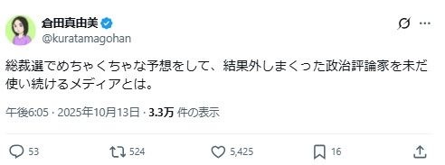 「総裁選でめちゃくちゃな予想をして、結果外しまくった政治評論家を未だ使い続けるメディアとは」と記述。続けて別の投稿で「素人評論家と何が違うのか」と投げかけた。