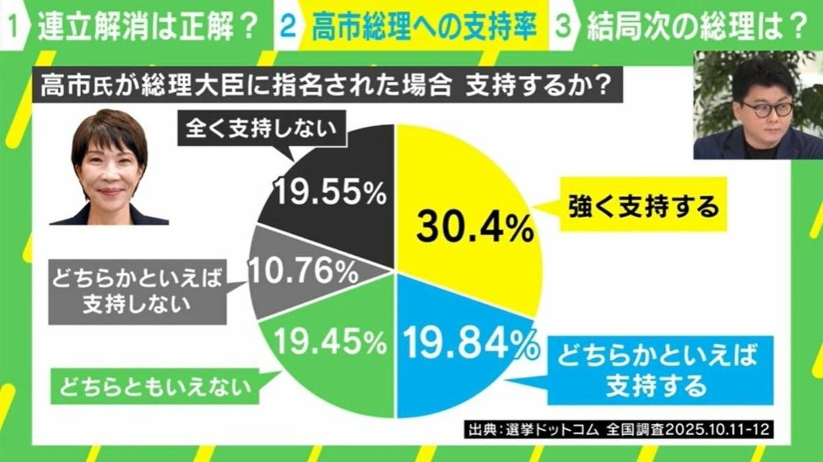選挙ドットコム」の「支持政党別 自公連立離脱をどう思うか?」という全国調査の結果によると、自民党の支持層の約5割、公明党の支持層の約8割が「評価する」と答えたことがわかった。また「高市氏が総理大臣に指名された場合支持するか?」という調査には、約50%強が支持すると回答している。