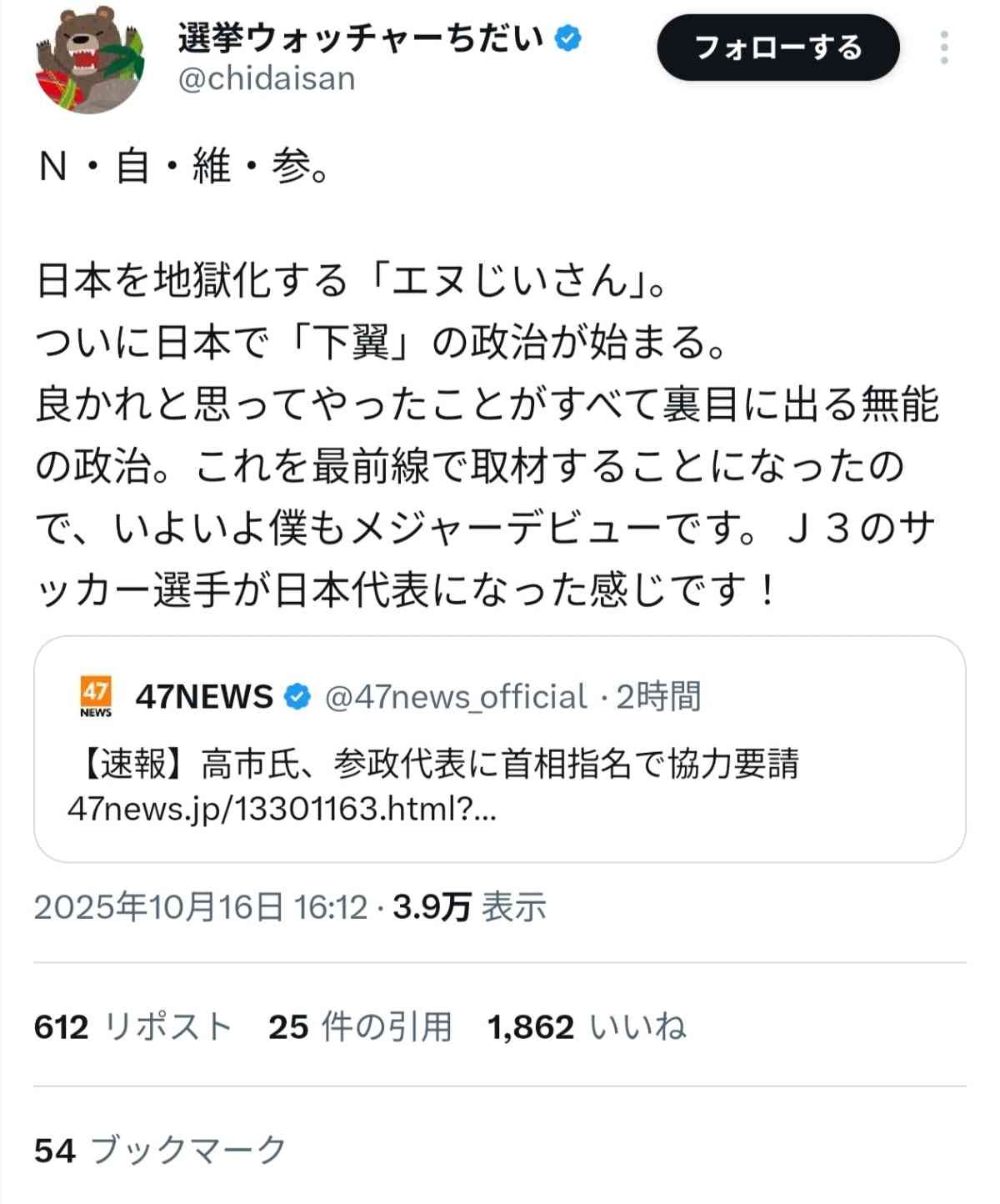 N・参政は首班指名依頼しただけなのに連立組むと思って大騒ぎしてる馬鹿ども草
