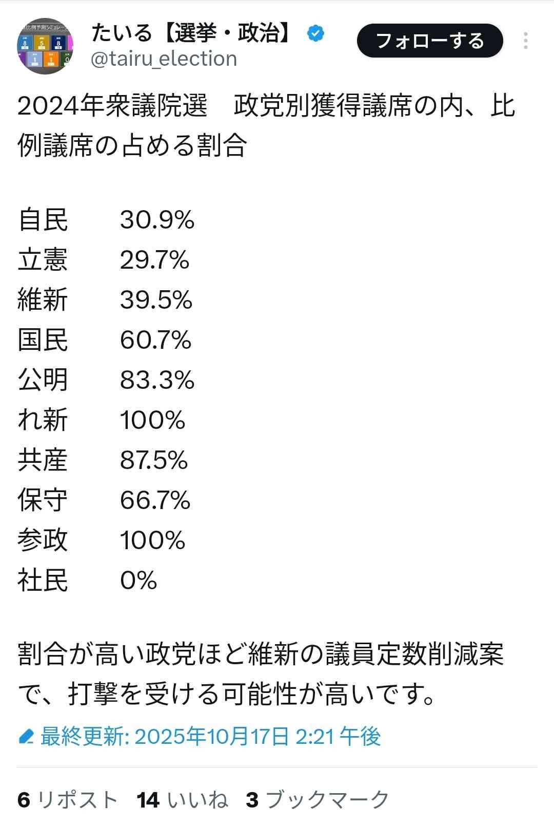社民 0%割合が高い政党ほど維新の議員定数削減案で、打撃を受ける可能性が高いです。