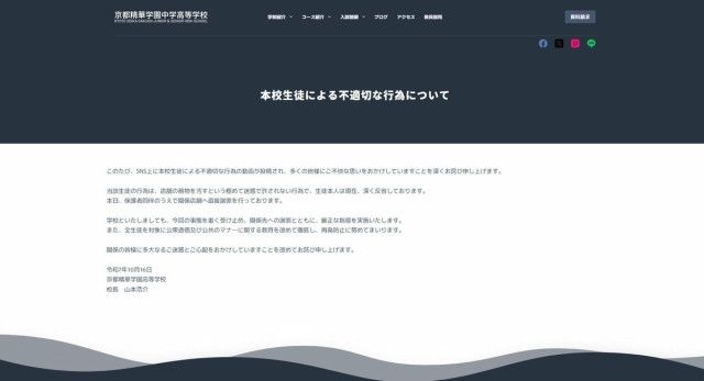 京都新聞京都精華学園高(京都市左京区)は16日、在校生が市内のファストフード店で、店舗の備品を汚したとして、「極めて迷惑で許されない行為」とホームページに謝罪文を掲載した。