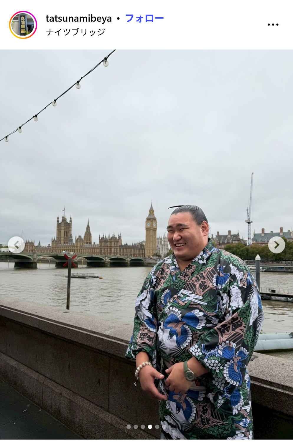 「ロンドンの街を両横綱が揃ってキティちゃんとお散歩 みんなとってもリラックスして楽しんでいますね」とのメッセージとともにホットドッグを手に笑顔いっぱいの豊昇龍や、キティちゃんとともに両横綱が歩いて騒然となる動画、国会議事堂でもあるウェストミンスター宮殿をバックにリラックスした表情の豊昇龍の写真をアップした。