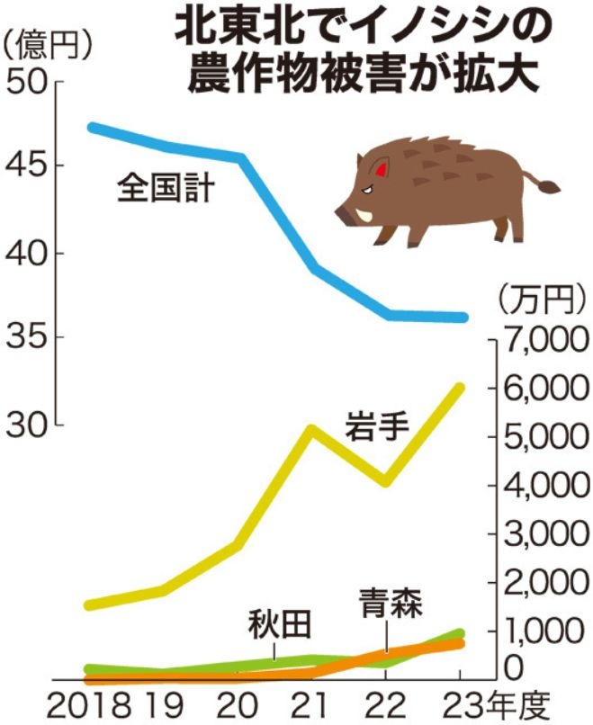 全国では被害が縮小する一方、北東北では降雪量の減少に伴って野生イノシシの生息域が広がり、農産物被害額は過去最大規模になった。高齢化などによる狩猟者の減少も被害拡大に拍車をかけている。