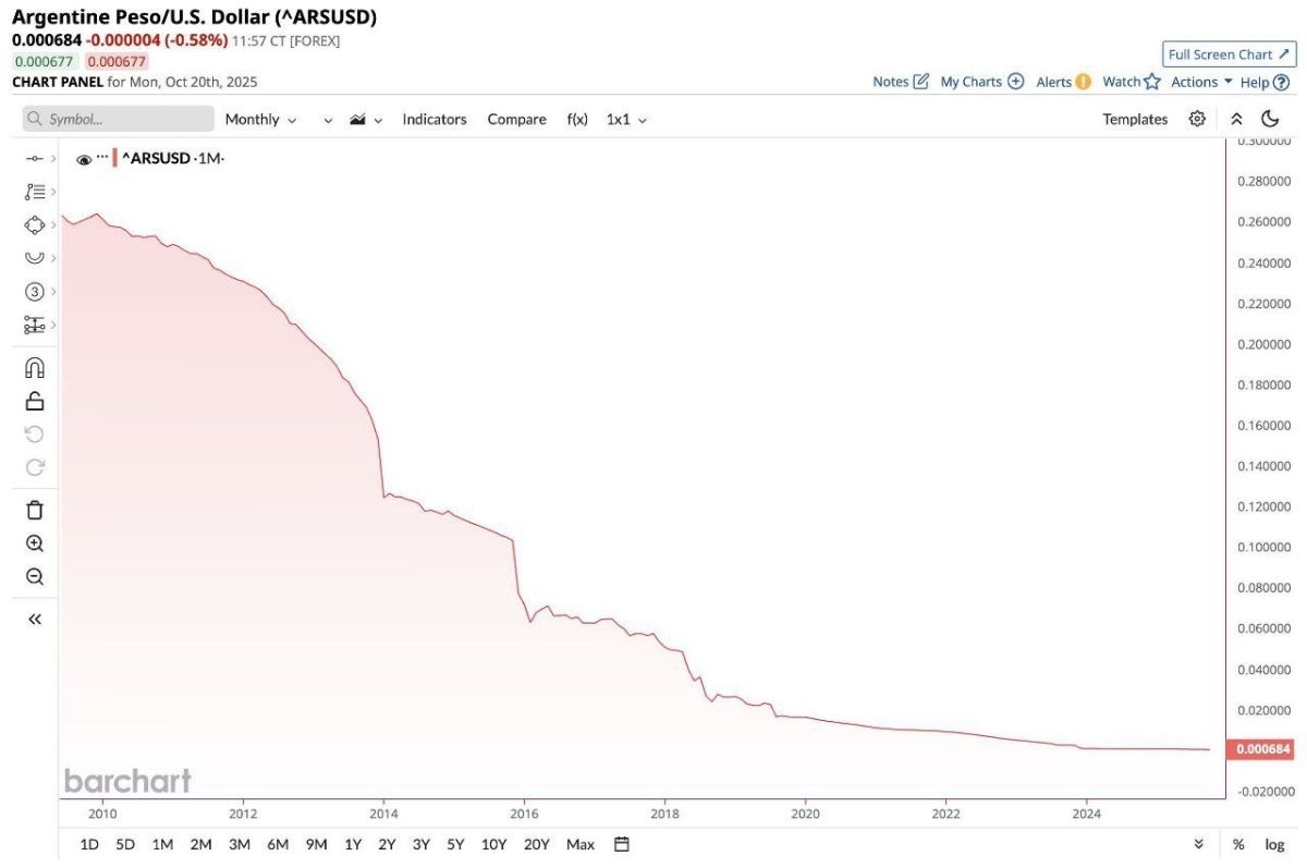 アルゼンチンの通貨ペソが米ドルに対して過去最安値を更新した。2009年以降の下落率はなんと99.8%に達し、ほぼ価値が失われた状態となっている。長年続くインフレと経済政策の混乱、外貨不足が主な要因とみられ、国民の購買力は深刻に低下している。