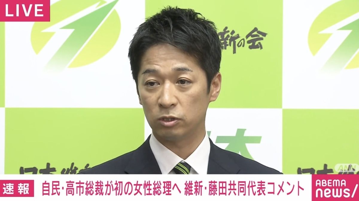 21日に自民党・高市総裁が女性初の総理大臣に選出されたことについて、連立を組む日本維新の会の藤田文武共同代表がコメントした。