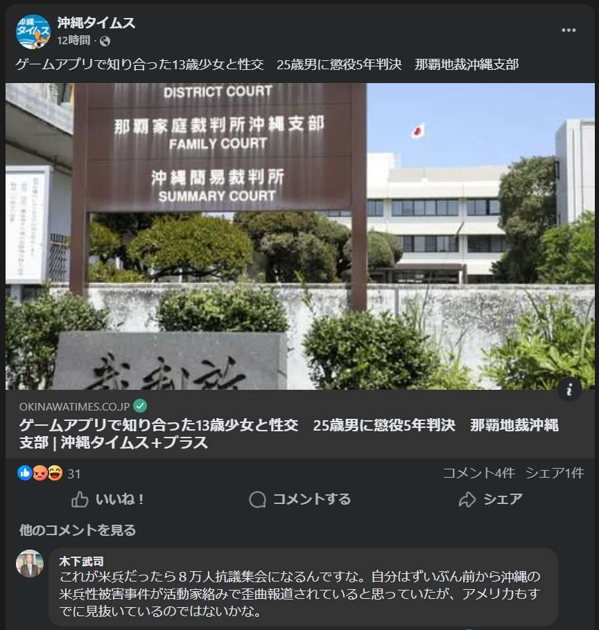 https://news.yahoo.co.jp/articles/86f8ffcaed59f9a0043417e3ff7a1aca00461857ゲームアプリで知り合った13歳少女と性交 25歳男に懲役5年判決 那覇地裁沖縄支部