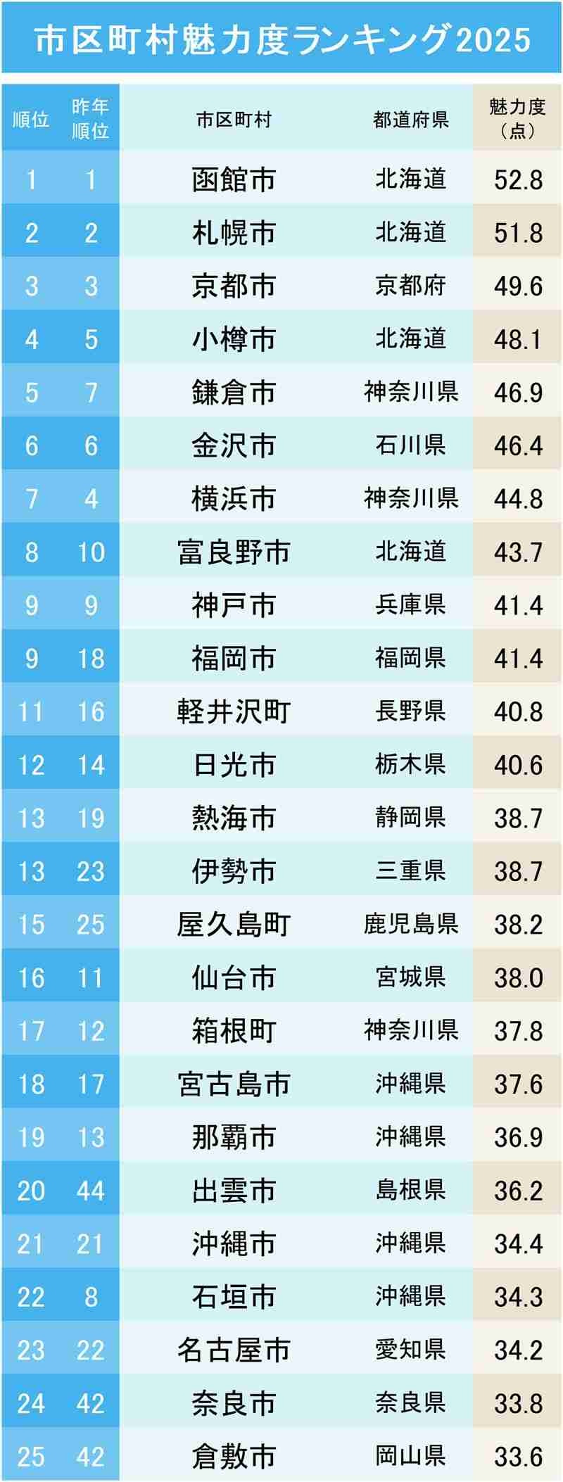 2025年の市区町村ランキングは、1位は函館市(52.8点)、2位は札幌市(51.8点)、3位が京都市(49.6点)となり、