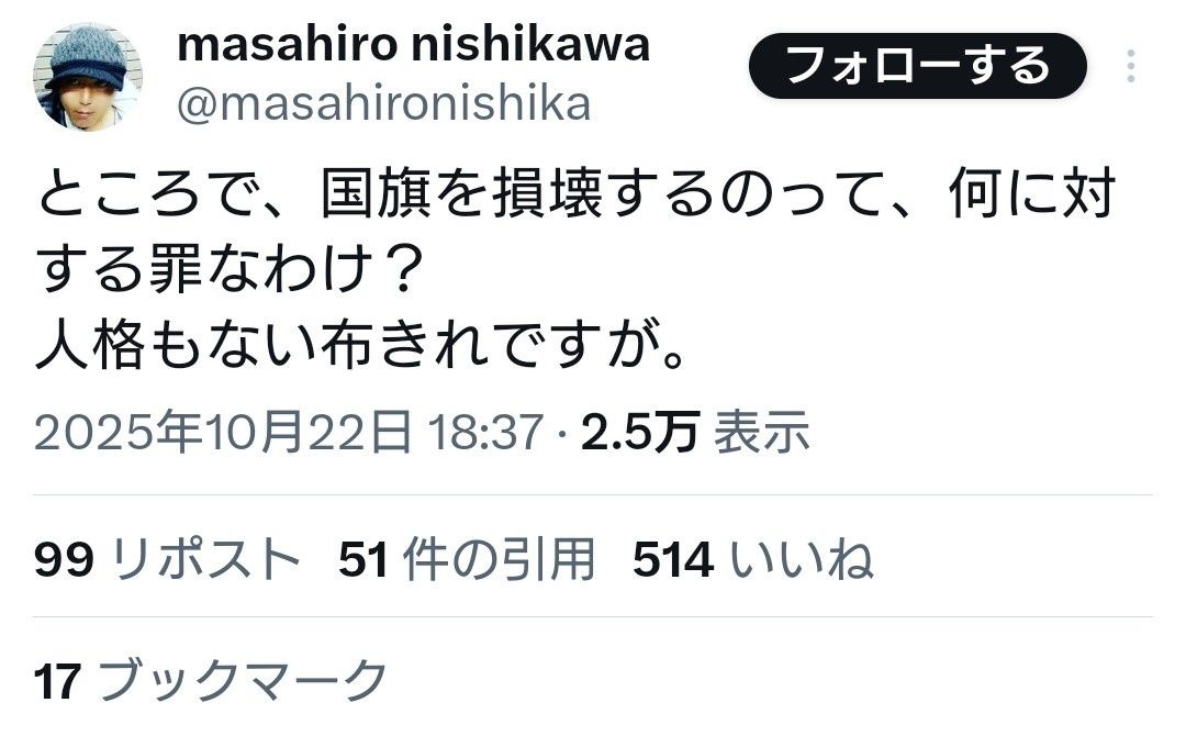 その人格もない布切れを損壊して何かを表現した気になってるお仲間の立場がないな