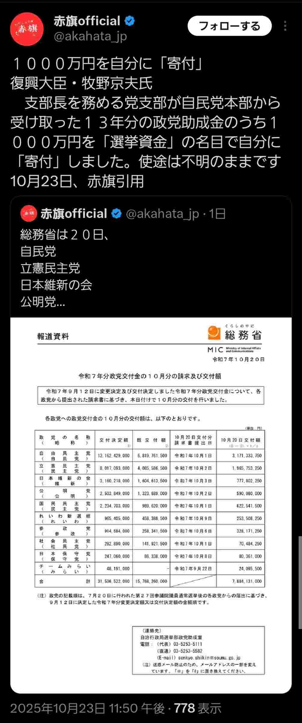 牧野復興大臣、自民党支部へ支給された助成金1000万円を「選挙資金」として自分に寄附😲使途は不明