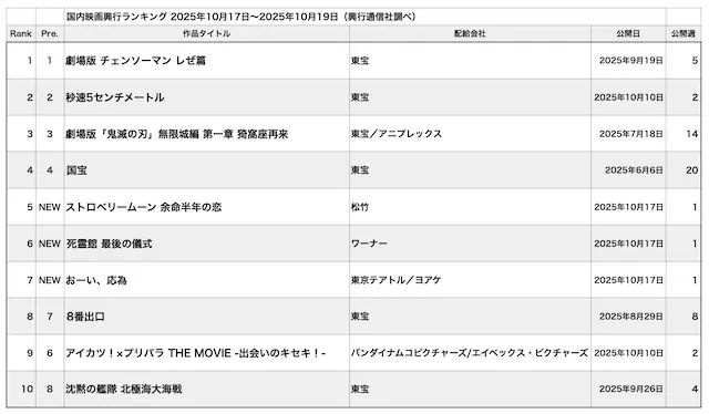 10月第3週の動員ランキングは、劇場版『チェンソーマン レゼ篇』『秒速5センチメートル』『劇場版「鬼滅の刃」無限城編 第一章 猗窩座再来』『国宝』の上位4作品の順位に変動なし。初登場作品で最上位となった、5位『ストロベリームーン 余命半年の恋』のオープニング3日間の興収は1億円にも満たなかった。相変わらず、6月からの東宝配給(共同配給含む)作品の寡占状態が続いている。