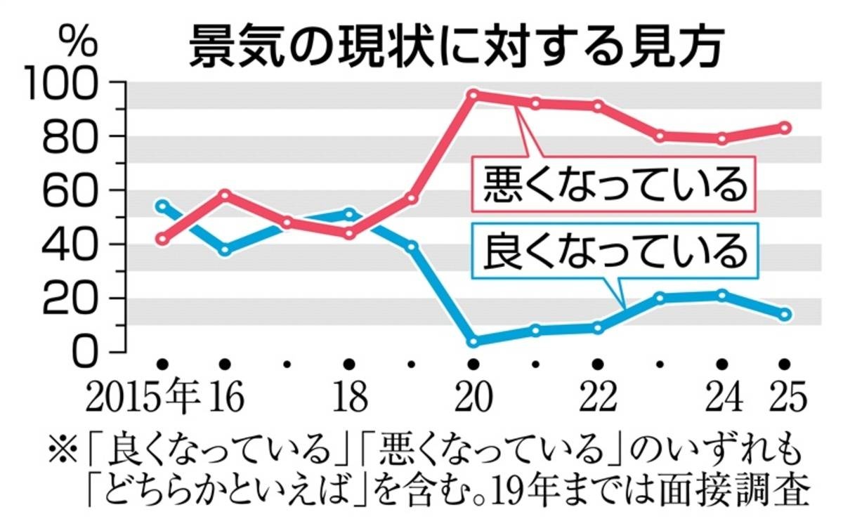 政府「日経平均49000円。過去最高益企業続出。賃金上昇。富裕層増加」日本人の83%「景気は悪くなった」