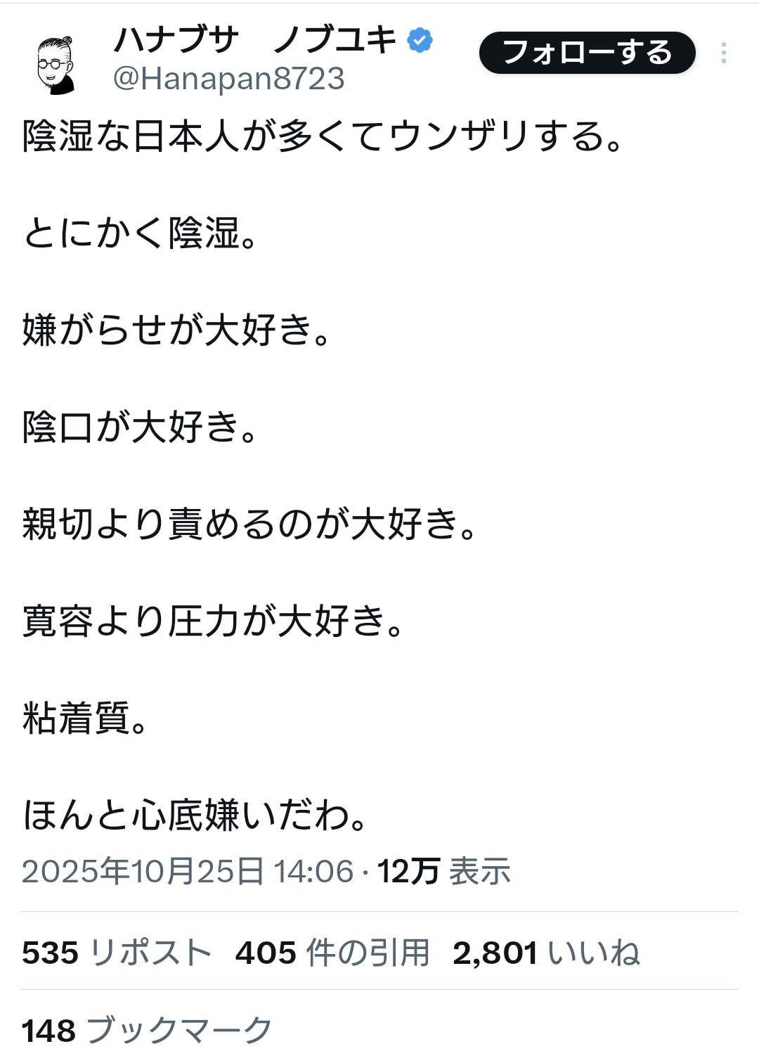 Xでそんなこと言ってる奴が2800いいねしか付かないってことは陰湿な日本人は意外と少ないってことなんじゃないのかね