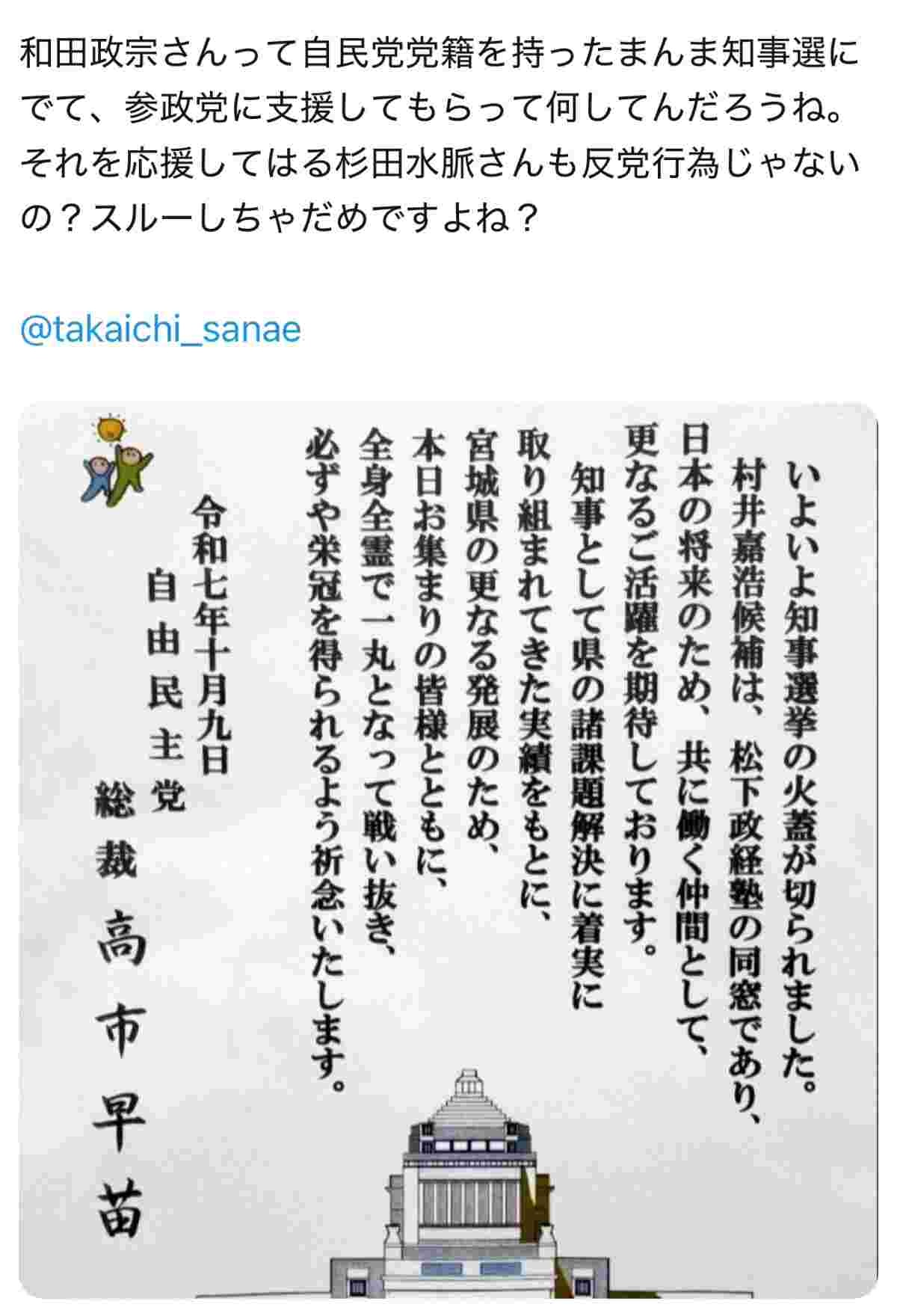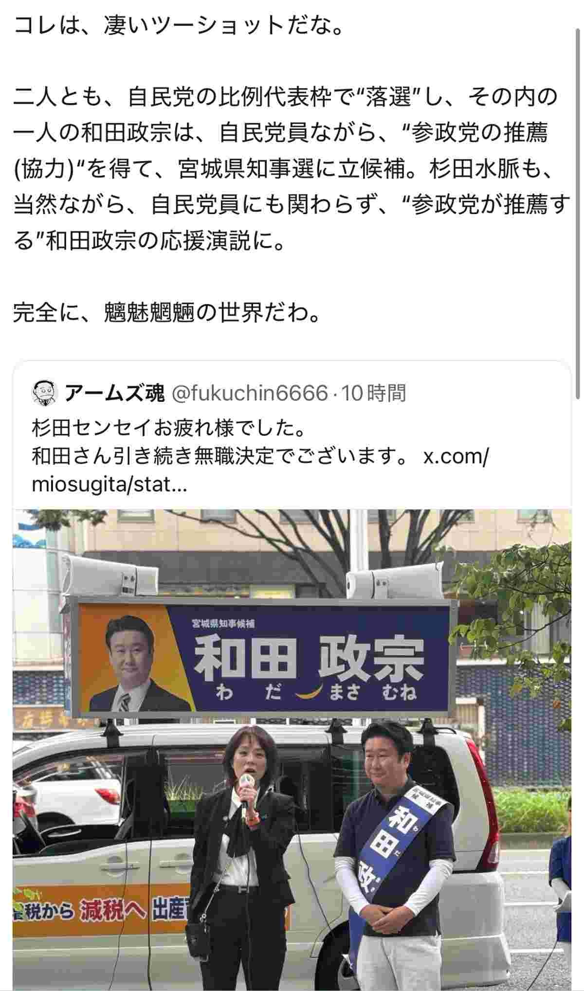 嫌儲の姫こと杉田水脈さん、ついに自民追放か?自民党を実質造反して知事選に出馬した和田政宗を応援していた模様