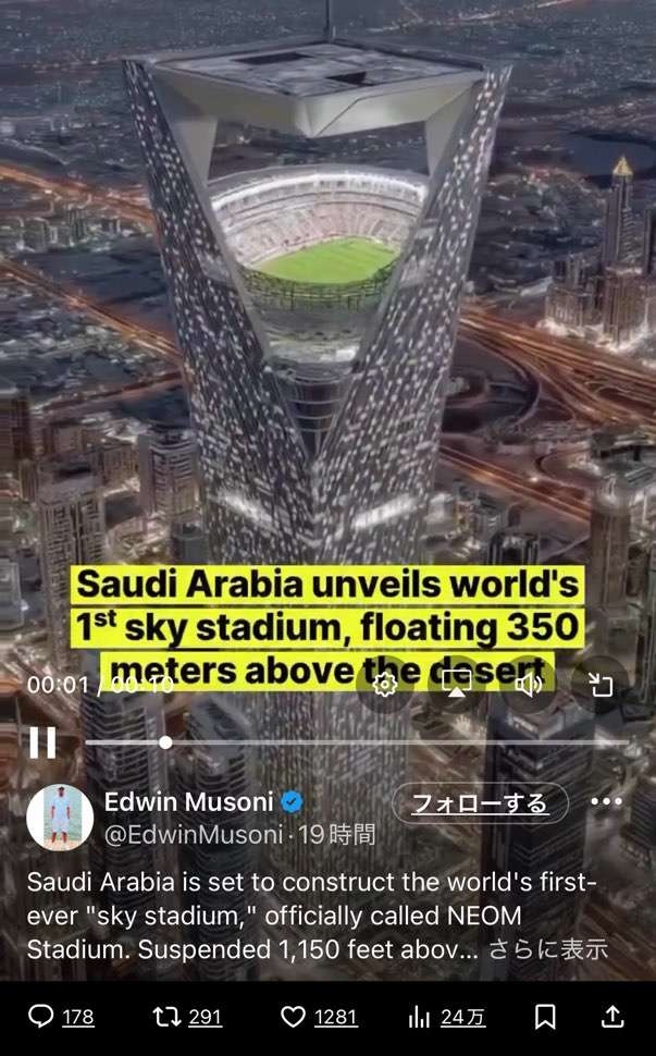 サウジアラビアは、世界初の「スカイスタジアム」、公式にはNEOMスタジアムと呼ばれるスタジアムの建設を計画しています。地上1,150フィートに浮かぶこの会場は、2032年頃に開業予定で、2034年のFIFAワールドカップの試合を開催します。