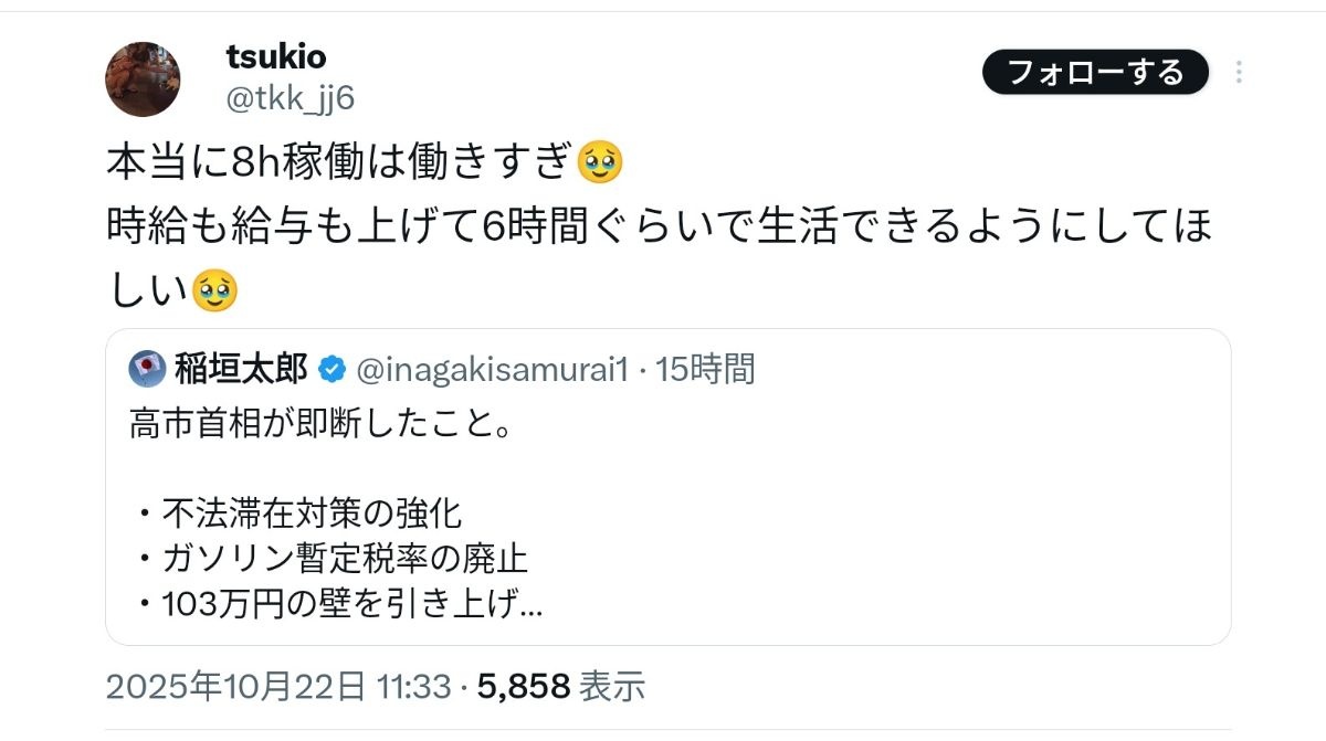 先に「ワークライフバランスを捨てるのは高市だけ!強要してない!」って太鼓持ち芸人やらコメンテーターやらインフルエンサー(笑)が無理矢理擁護してた経緯があるから勘違いするやつが現れても仕方ない