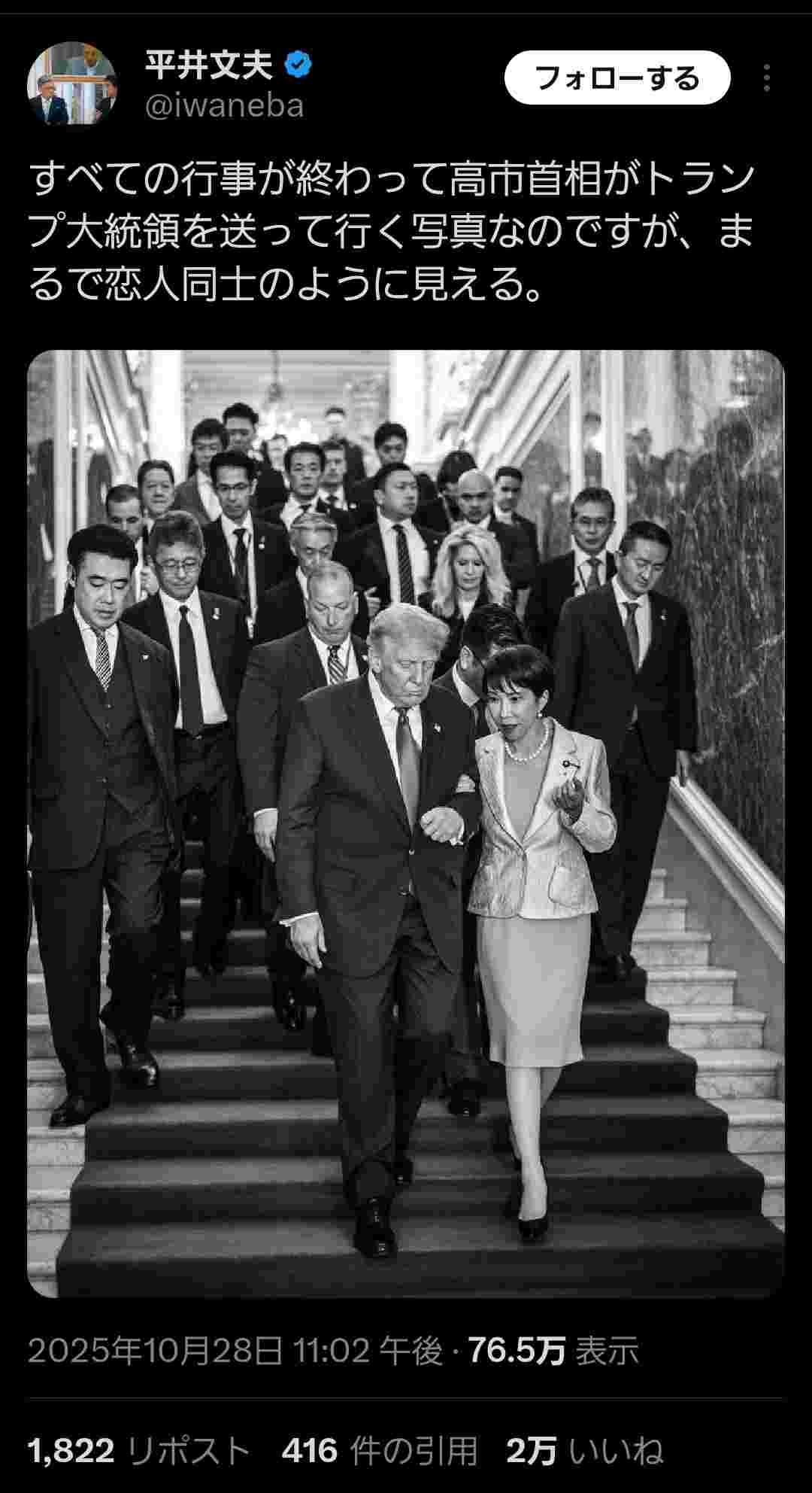 フジ解説委員「高市首相がトランプを送っていく写真、まるで恋人同士のよう🥰」2万いいね