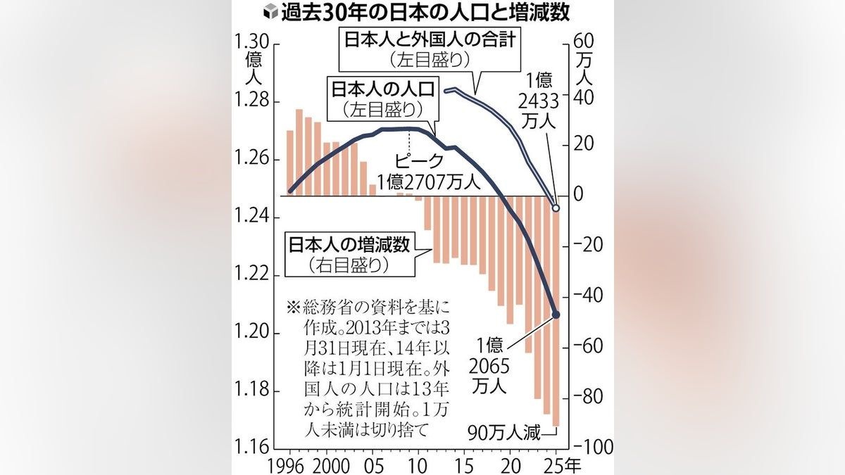 婚姻数は90年ぶりに50万組を下回った2023年に続き、昨年も48万組余り。外国人を除いた日本人の人口は1億2065万人(1月時点)で、この1年だけで約90万人減った。
