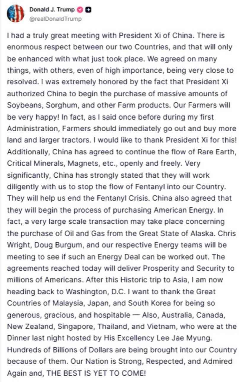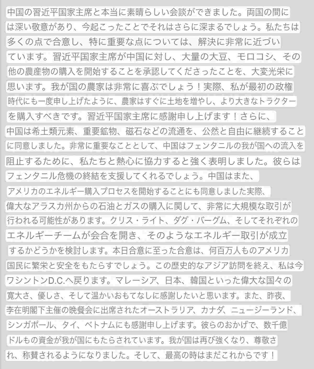 トランプがアジア歴訪の総括としてSNSに投稿したんだけど?