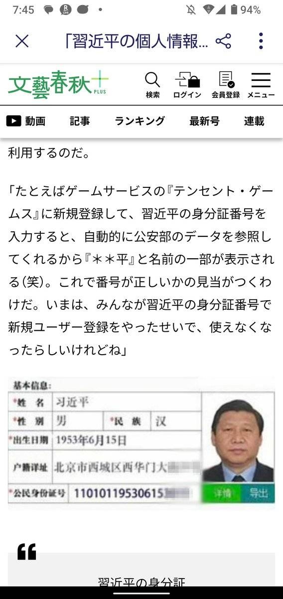 「中国人民はみんな、18桁の身分証番号を割り当てられている。すなわち、最初の6桁が戸籍登録地の地域番号、次の8桁が生年月日、残る4桁のうち1桁は性別だ。これは習近平だって例外じゃない」