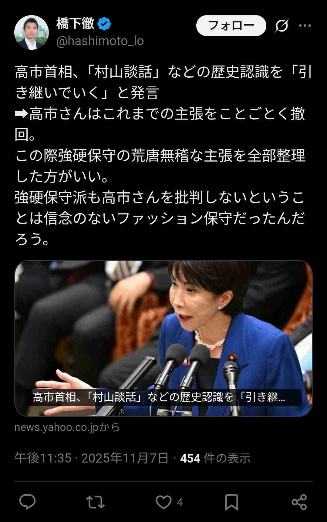 もともと高市自身が総理になったら村山談話を修正するってイキリ発言してたから、実際に総理になって何と言うのかみんな注目してたんだよ
