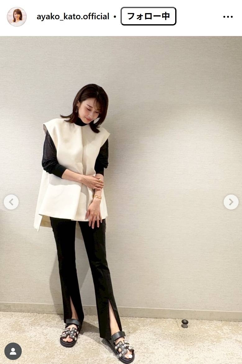 元フジアナ加藤綾子、胸元透け感白トップス&スリット入りパンツコーデ公開「大人のエレガント」