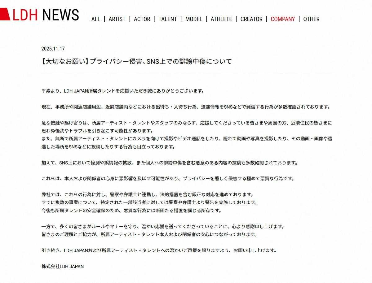 「現在、事務所や関連店舗周辺、近隣店舗内などにおける出待ち・入待ち行為、遭遇情報をSNSなどで発信する行為が多数確認されております」「また、無断で所属アーティスト・タレントにカメラを向けて撮影やビデオ通話をしたり、隠れて動画や写真を撮影したり、その動画・画像や遭遇した場所をSNSなどに投稿したりする行為も目立っております」とファンによるプライバシーの侵害行為が散見されることを報告。