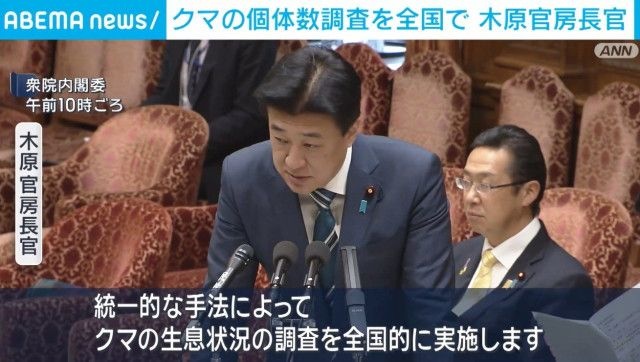 ABEMA TIMES各地でクマによる人身被害が相次いでいることを受け、国会の衆議院内閣委員会で木原官房長官はクマの個体数の調査を全国的に実施する考えを示しました。