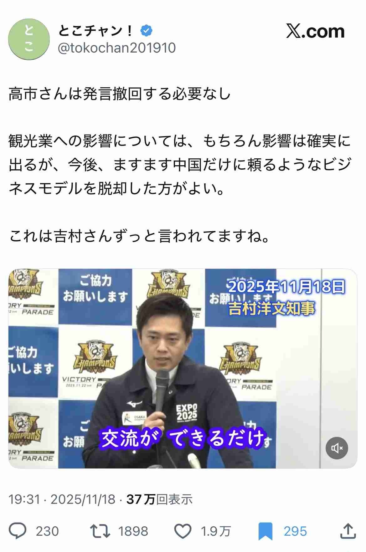観光業の皆さん、関係者の皆さん、それで利益を得ている皆さんは多いと思いますし、これ(特に)大阪にも多いと思いますが、中国人観光客だけに頼るビジネスモデルは変えていかないといけない。そして、これは今回だけじゃなくてこれからも起きることだと、僕は認識した方がいいと思っています。