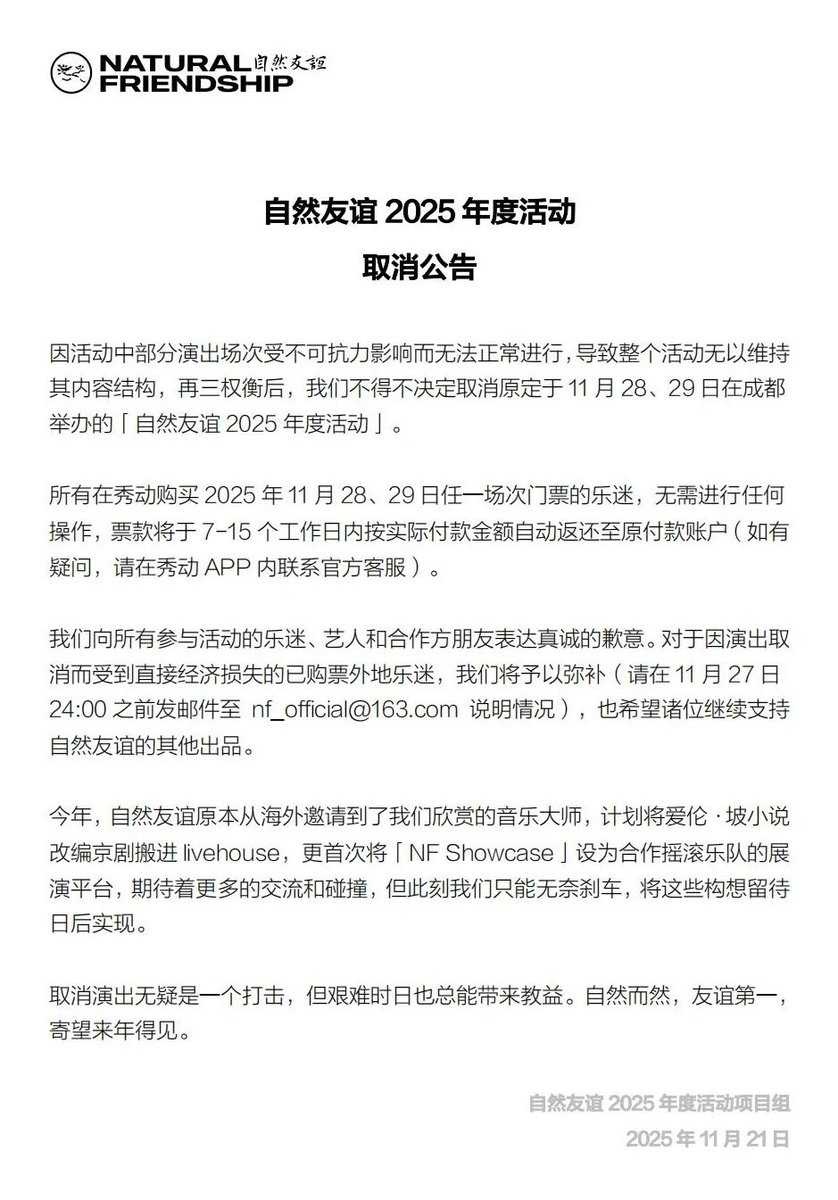 コーネリアスのSNS公式アカウントでは「『NATURAL FRIENDSHIP 2025』開催中止のお知らせ」としてイベント側の公式発表を引用。中止の理由は「不可抗力により、イベントの内容を維持できなくなったため」とされている。
