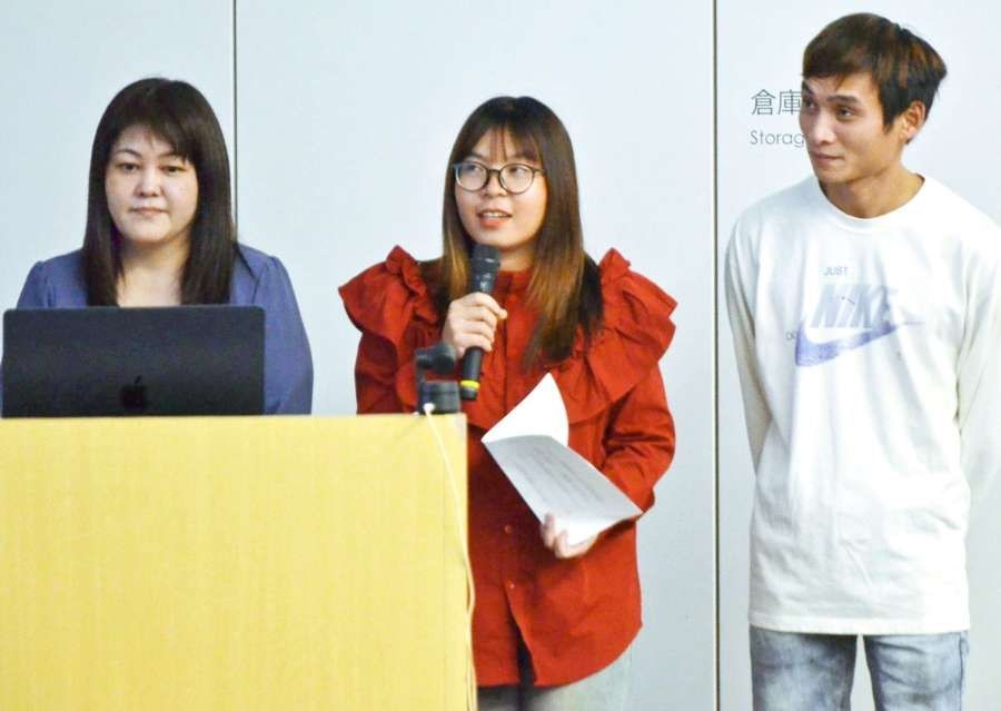 枕崎市で特定技能生として働くベトナム人女性(26)は夫と登壇し、日本で出産した経験を語った。