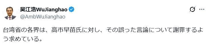 中国駐日大使がX投稿「台湾省の各界は高市氏に対し謝罪するよう求めている」にツッコミ殺到(日刊スポーツ)