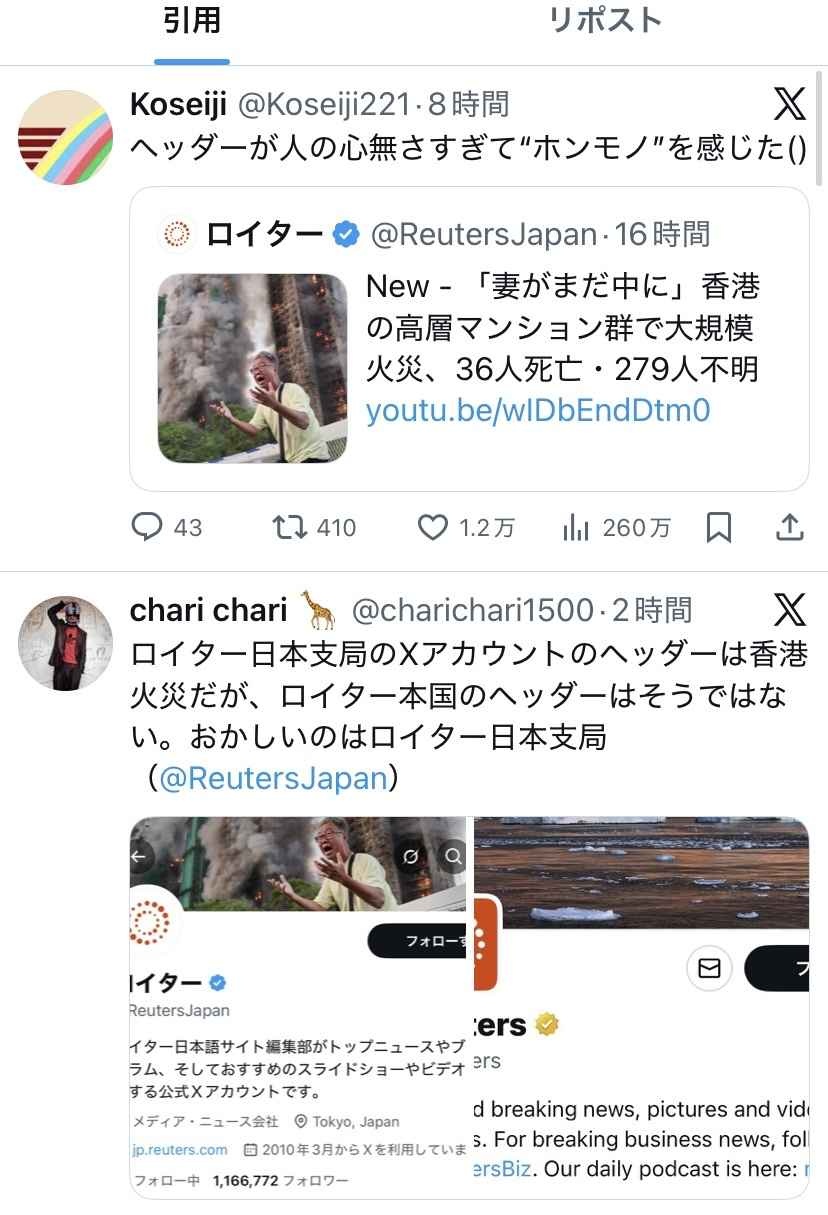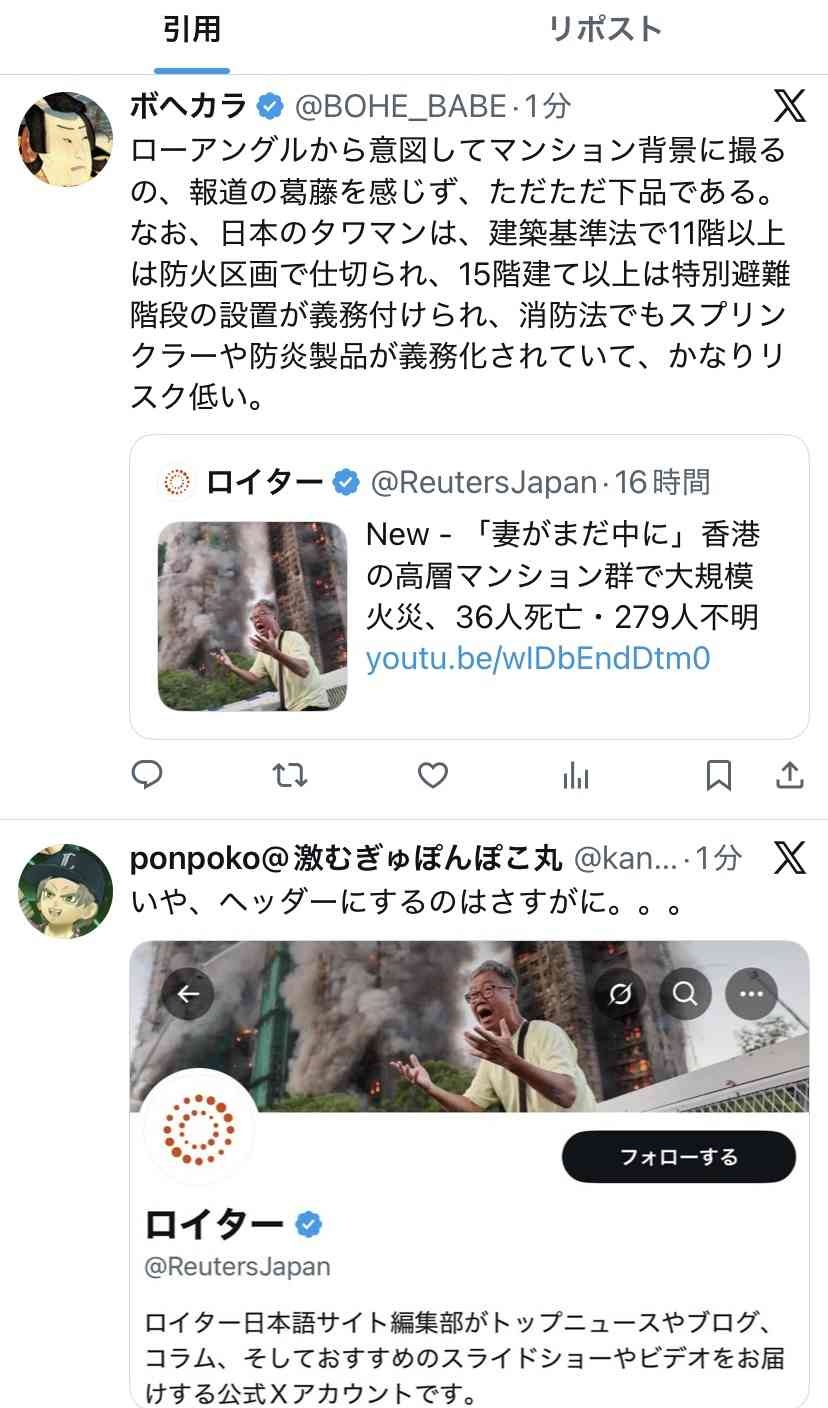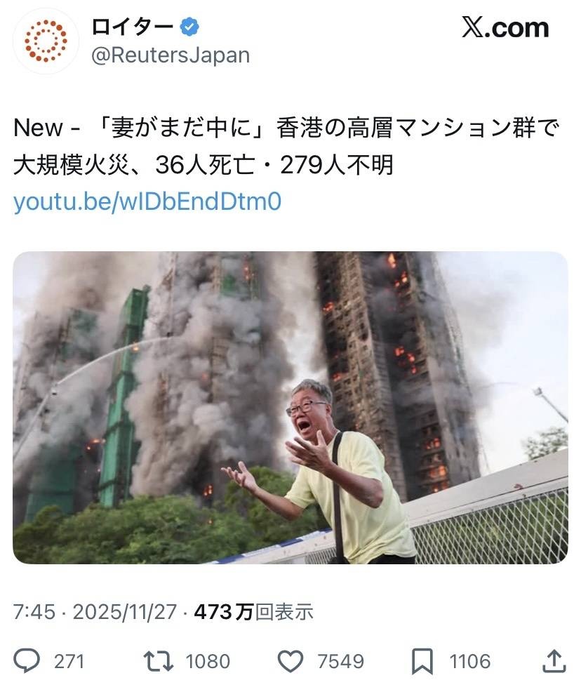 【画像】ロイターさん、香港大規模火災の被害者の写真をヘッダーに使って炎上。これ中身バカウヨだろ…