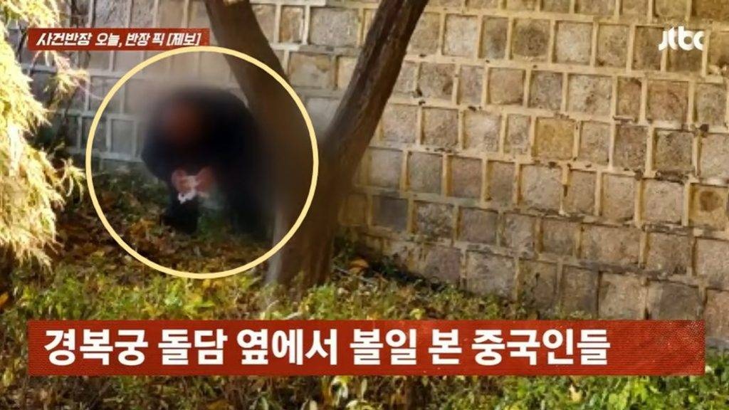 10日午後、景福宮の石垣道の下で用を足す中国人男性