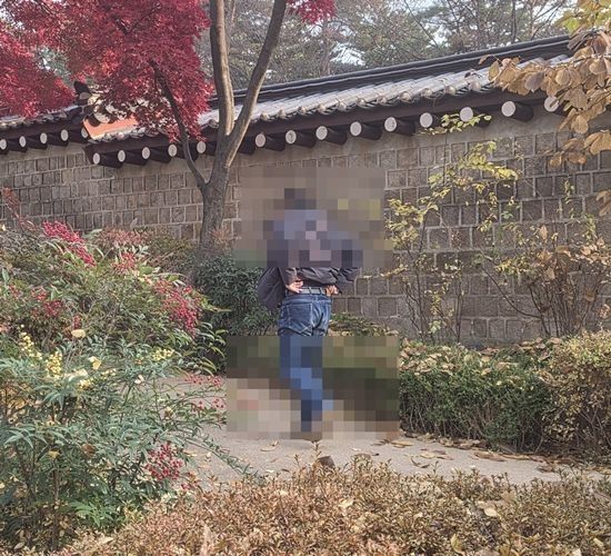 24日午後、ソウル鍾路区の大統領府近くの草むらで、ある中国人観光客が用を足した後、慌ててズボンを上げている