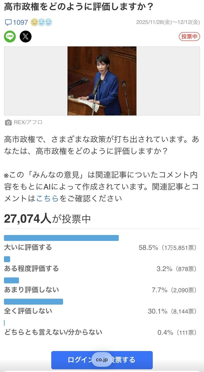 高市の政治能力に疑問を呈するのは分かるけど、こんな場末のアンケート1つを取り上げて「決定的証拠」とかいっんのやってること高市信者と変わんねぇぞ