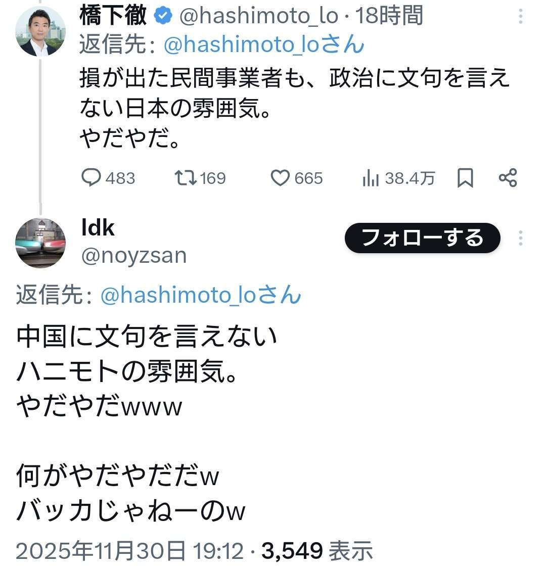 橋下徹氏「損が出た民間事業者も政治に文句を言えない日本の雰囲気。やだやだ」