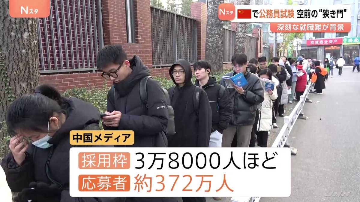 「北京の試験会場の前では、大勢の受験生たちが門が開くのを待っています」中国・北京では、早朝から国家公務員の試験を受ける人々が試験会場で長い列をつくりました。中国メディアによりますと、3万8000人ほどの採用枠に対して、応募者はおよそ372万人。
