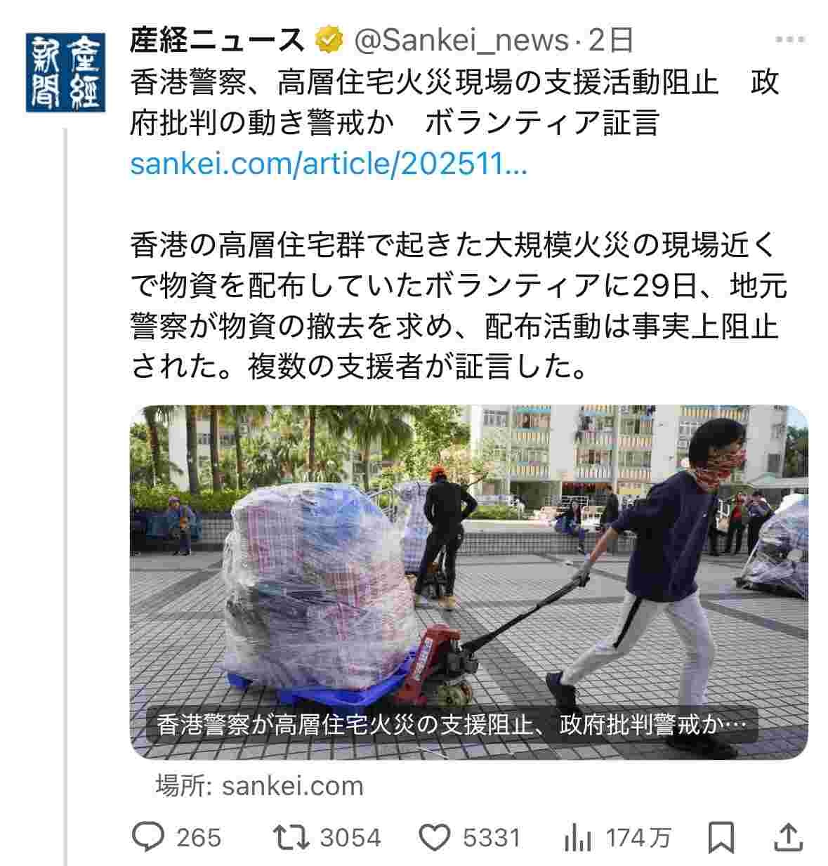 香港マンション火災現場近くの無償物資配給所、当局指示で撤去…民主派の抗議活動再燃を警戒