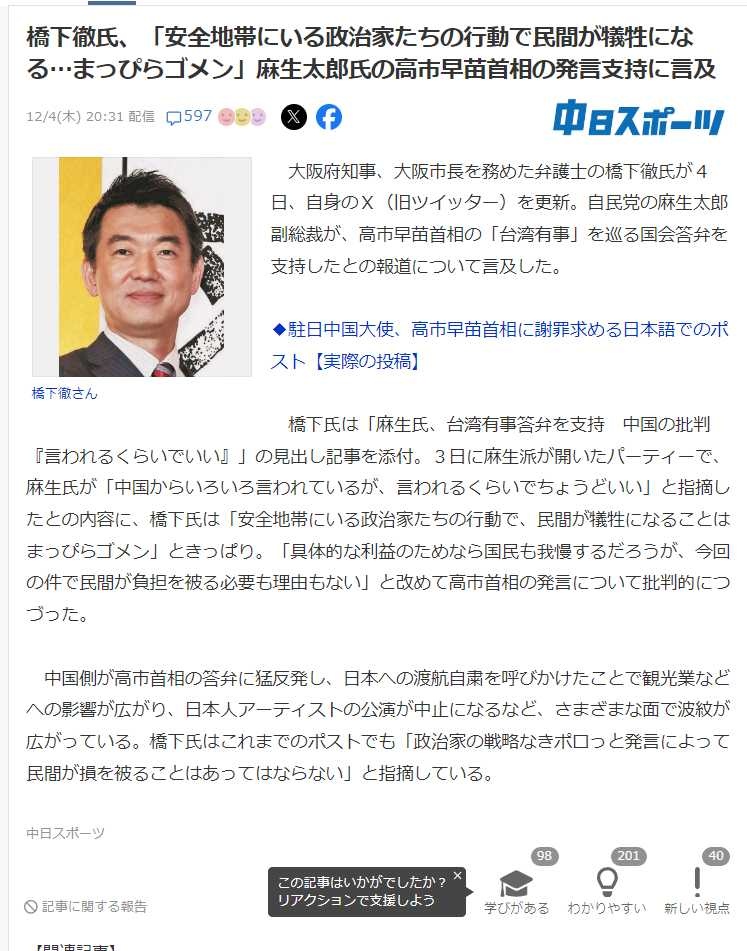 お前が作った維新が自民党と連立組んで調子のらせてる責任はよとらんかい