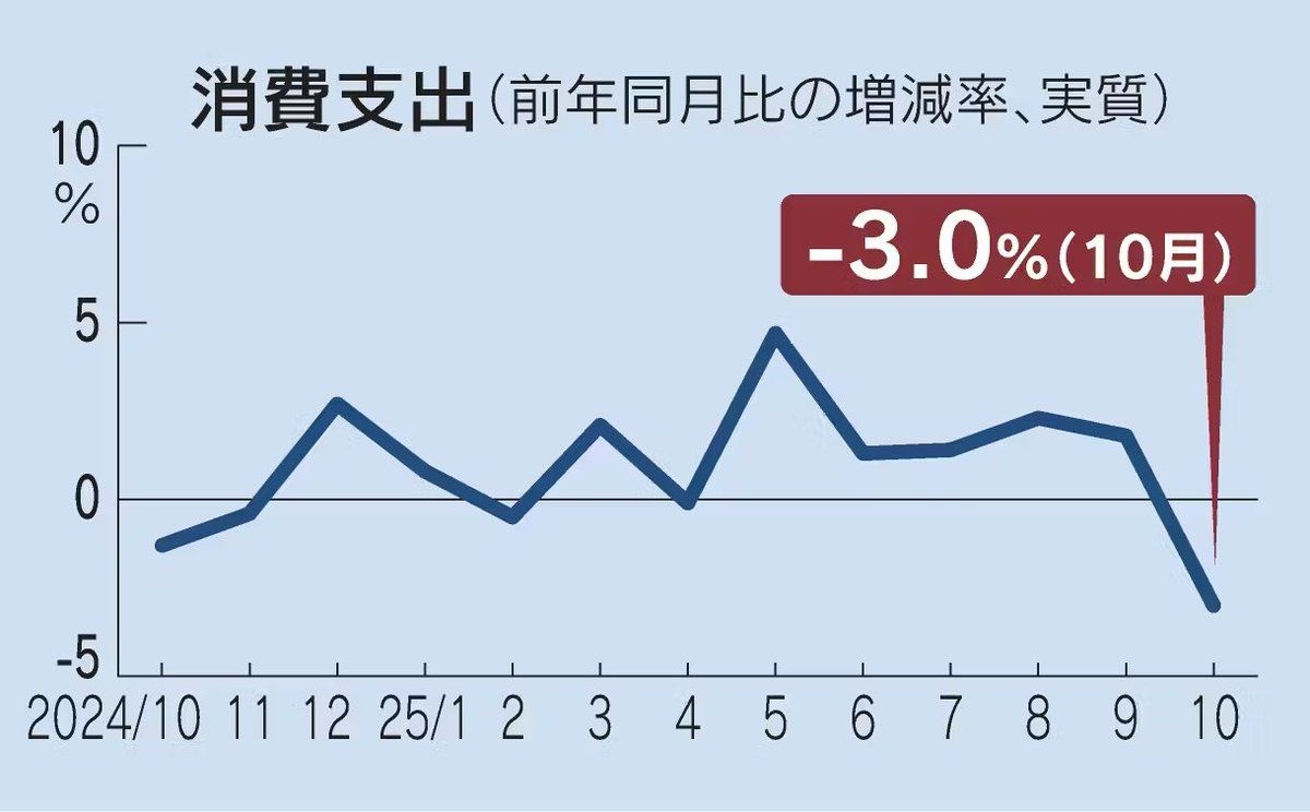 世帯の消費支出6か月ぶりマイナス、前年同月比3・0%減の30万6872円…10月家計調査