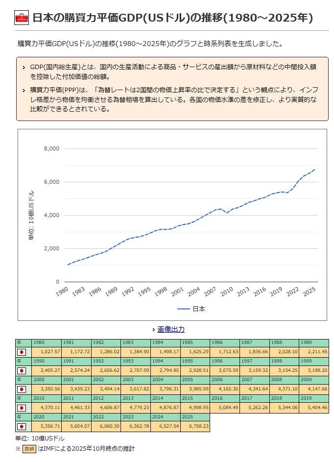 既に公表された過去の実績値だけでなく、翌年以降の予測値が含まれます。この予測値は、IMFが独自に開発した経済モデルや、
