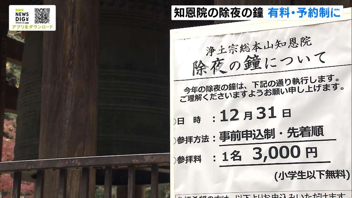 京都の知恩院は今年の大みそかの「除夜の鐘」の参拝を有料化し、境内で予約の受付けが始まりました。