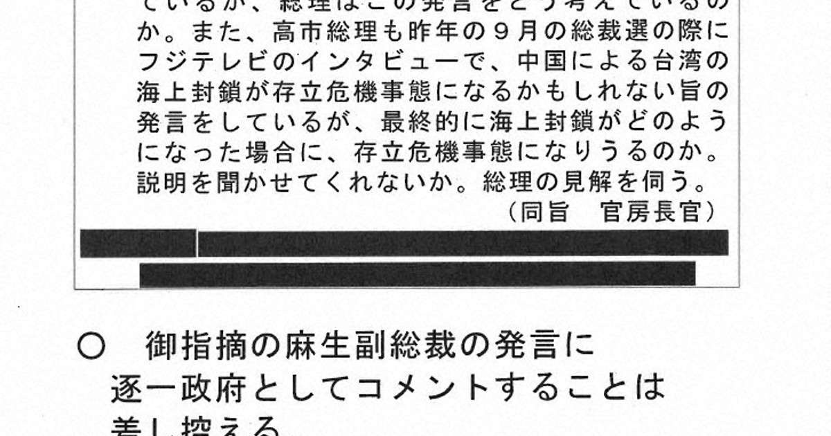 資料には首相答弁に該当する部分は存在せず、台湾有事について「政府として答えない」とも明記されていたが、「答弁書通り」の発言にはならなかった。