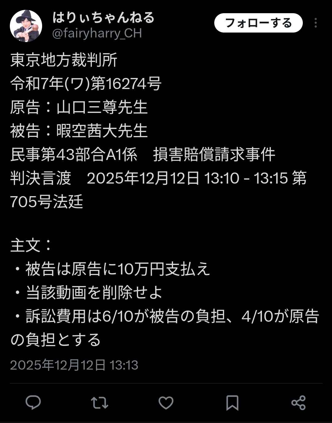 10万と費用6:4とか迷惑料分含めたら実質暇空の勝ちじゃん
