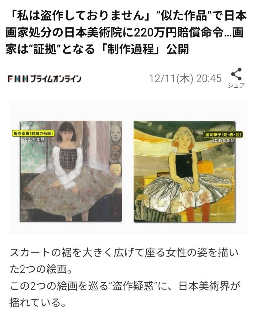梅原氏自身も所属していた「日本美術院」の理事会が、出品した絵画を「別の画家の作品と似ている」と問題視。