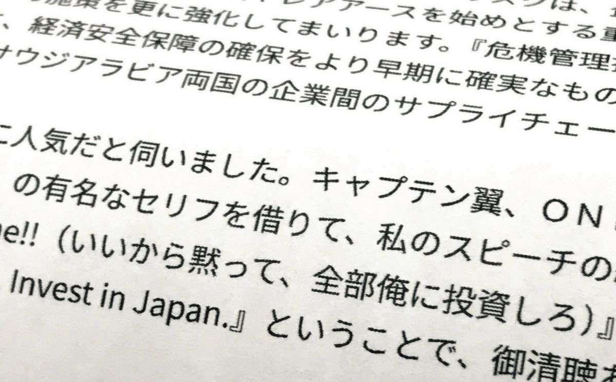 サウジアラビアの投資ファンドなどが1日に東京都内で開催したイベント。講演した高市早苗首相は、人気漫画「進撃の巨人」の主人公エレン・イェーガーが発したセリフにちなんで英語で発言。対日投資の拡大を高らかに呼びかけた。