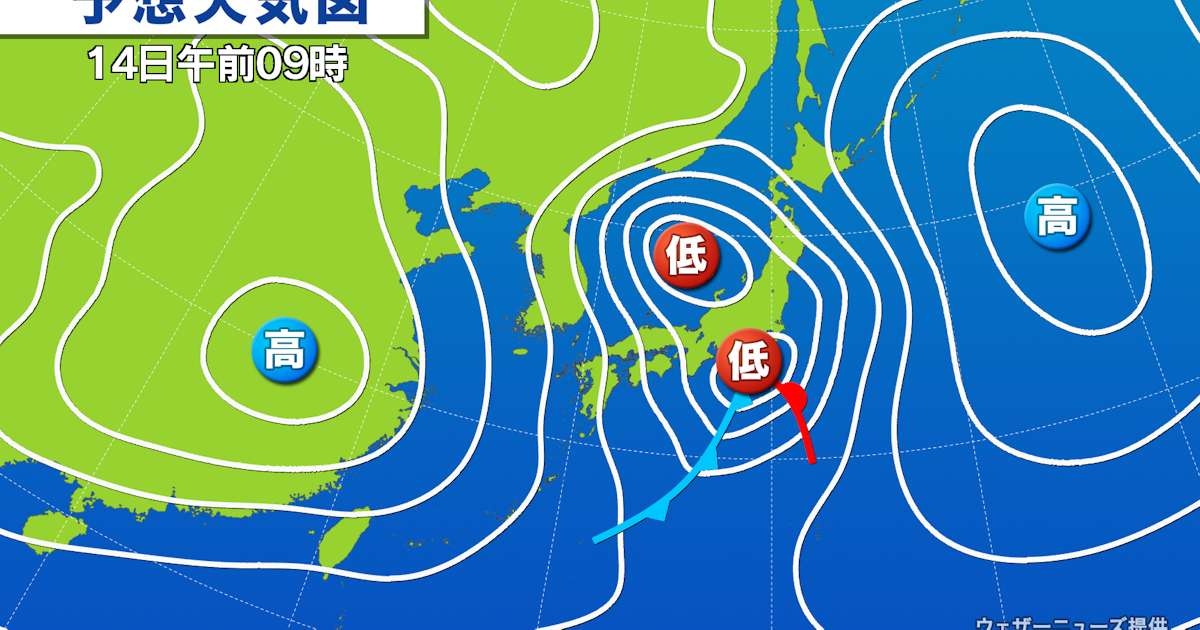 気象庁によると、低気圧が14日にかけて急速に発達しながら本州の太平洋側を通って北海道付近に移動。東シナ海の低気圧も対馬海峡を通って急速に発達しながら東北地方へ進む。15日は、北海道付近の低気圧がオホーツク海に進んで日本付近は冬型の気圧配置となる見込み。