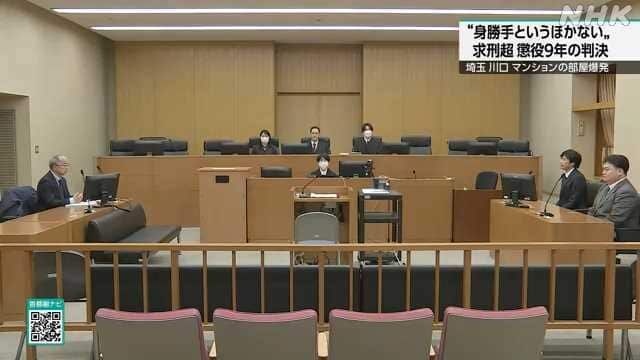 去年、埼玉県川口市でガスを充満させたマンションの部屋に火をつけて爆発させ3人にけがをさせた罪などに問われた被告に対し、さいたま地方裁判所は「自殺しようと火を付けたのは身勝手というほかなく、責任は重大だ」として、求刑を上回る懲役9年の判決を言い渡しました。